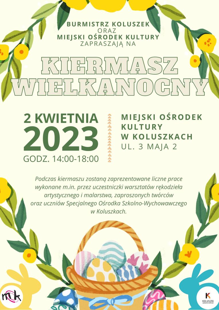 Serdecznie zapraszamy na Kiermasz Wielkanocny, który odbędzie się 2 kwietnia 2023 r. w godzinach 14:00-18:00 w Miejskim Ośrodku Kultury w Koluszkach.