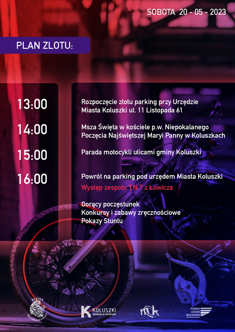 Burmistrz Koluszek, Starosta Łódzki Wschodni, Miejski Ośrodek Kultury w Koluszkach oraz BIZON - Moto Klub Koluszki zapraszają na X Koluszkowski Zlot Motocyklowy, który odbędzie się w dniu 20 maja 2023 r. na parkingu przy Urzędzie Miejskim w Koluszkach.